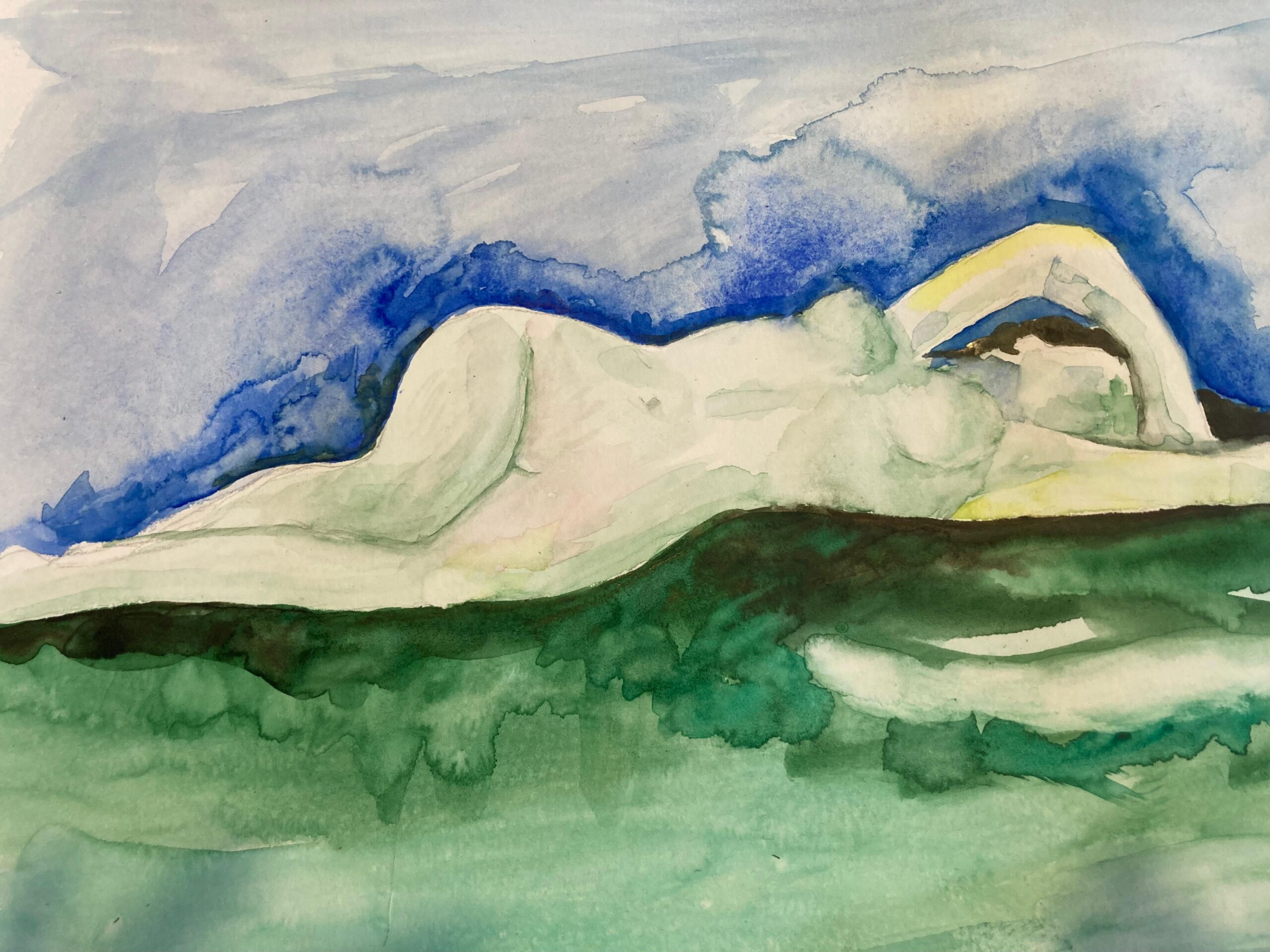Pintura acrílica, acuarelas verdes y azules sobre cartulina titulada ‘Acostada’, obra de la pintora valenciana María Sancho realizada en 2024.